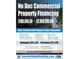 NO DOC COMMERCIAL/MULTIFAMILY PROPERTY FINANCING UP TO $2,000,000.00.No Tax Returns and No Bank Statements. 5-Year ARM or 30-Year Fixed Rate. 700 Minimum Credit Score. MOST PROPERTY TYPES QUALIFY: Multifamily 5+ Units, Mixed Use, Retail Spaces, Automotive, Restaurant & Bar, Office Building, Mobile Home Park, Strip Centers, Light Industrial, Day Care Center, Warehouse, Office Building, Commercial Condo. Fast 24-hour prequalification with no credit report pull required.