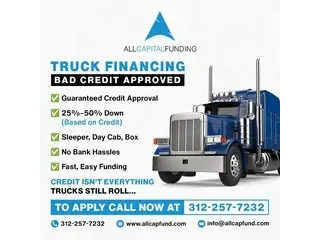 Even with poor credit, All Capital Funding helps you obtain financing for Commercial Truck. To enable you to take on large projects with small power, All Capital Funding provides quick approvals, flexible down payments, and guaranteed financing. Give 312-257-7232 a call or send a text right now. Go to https://allcapfund.com/ for additional information.